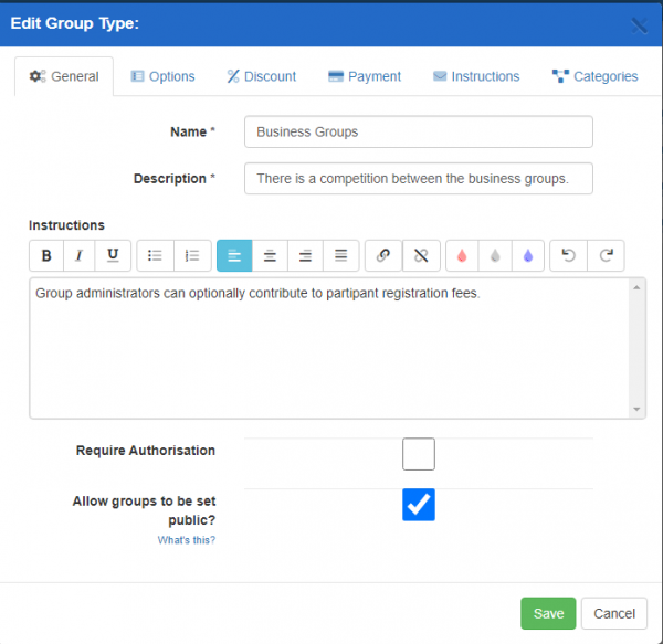Require Authorisation: Do you require Groups of this type to be authorised by the Event Team before participants can join this group. Most commonly this isn't required.