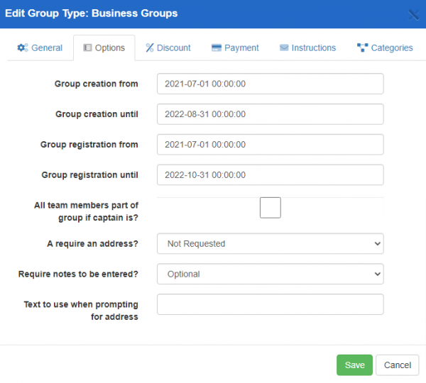There are 2 parts to the groups setup - Group Options and Group Types. We'll explain these below.