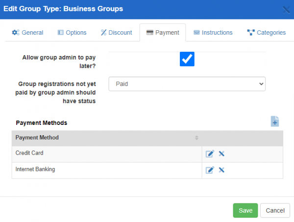 For example a Business Group whereby you may allow the Group Admin to make a single payment at some later point, and social groups which you want each participant to pay for themselves at the time they enter.