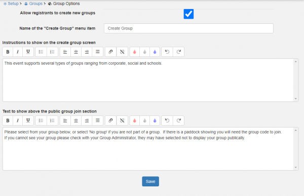 Allow registrants to create new groups: If this is checked the option to Create Groups will be available to participants.