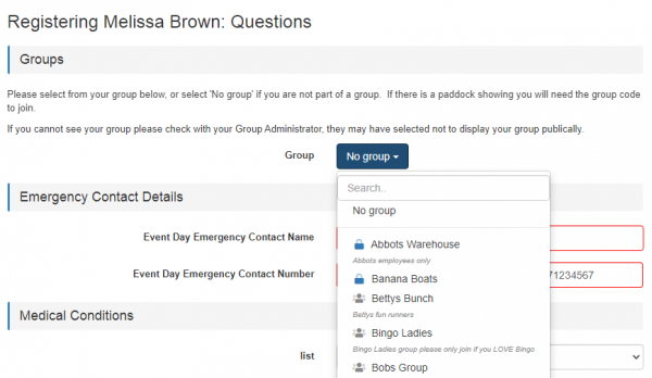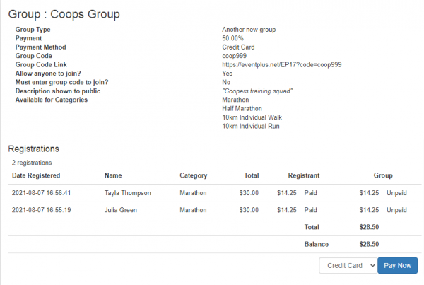 Details of the group can be viewed anytime and payments made if the group administrator is making a contribution towards the registration fee.