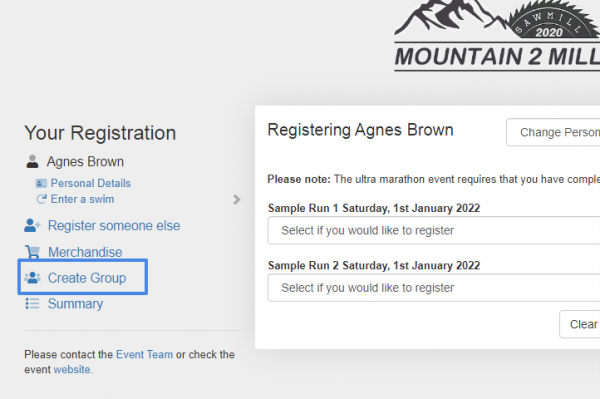 If Groups are enabled (as explained above), the Group can be setup by clicking on the 'Create Group' button on the event landing page, or clicking on the 'Create Group' option on the left panel.