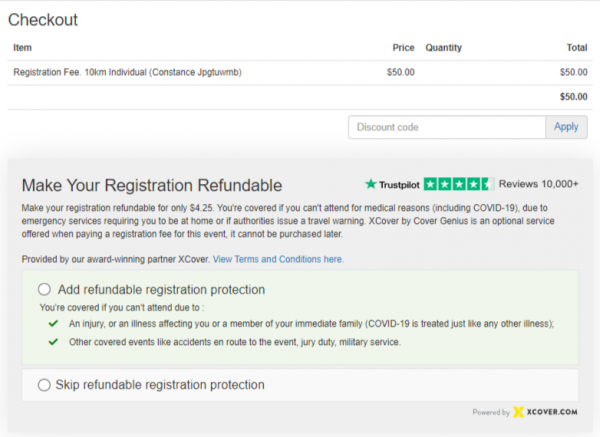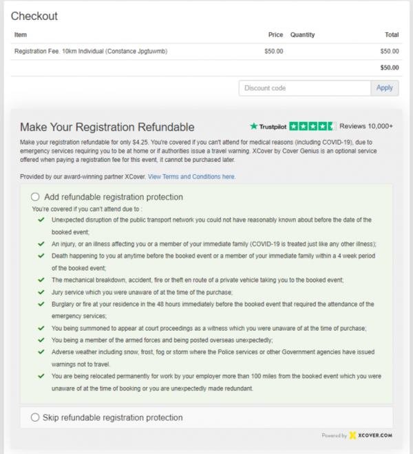 Event participants who register for events which are using XCover will be given the option to take out refund protection during their online registration journey. Those that opt for protection will be instantly protected against unforeseen circumstances which include things such as accident, injury, illness, death, weather disruption, and transportation issues. All customer refund requests are managed and handled internally by XCover.