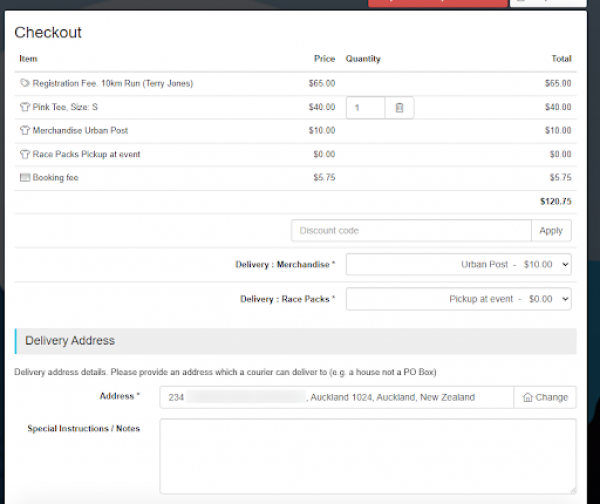 • Delivery option at checkout - Participants choose their delivery option(s) whenever their order includes a merchandise item and/or registration that has Delivery enabled.