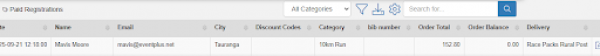 • Columns shown: Name, Email, DOB, Sex, Identifier (e.g. Bib/Race No), Category, Division, Order Payment Status, Order Balance, Delivery Option, Delivery Address