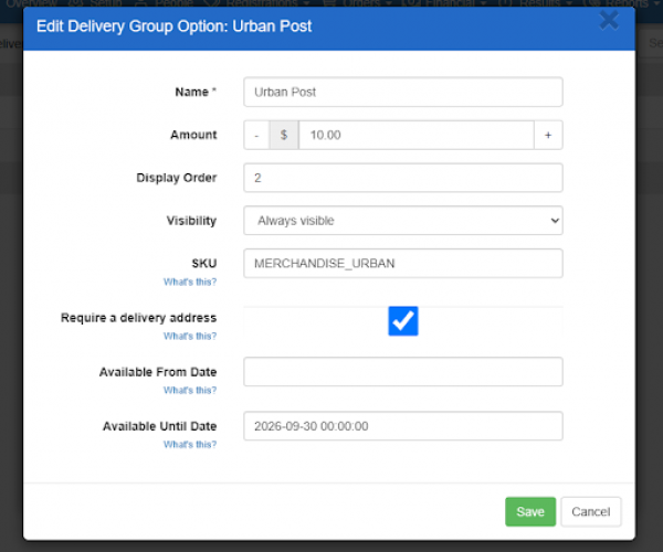 Available from / to Date range when the option can be selected. Useful for setting a postage cut-off time.