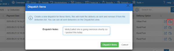 Once an item is recorded as delivered, it is removed from the Delivery List and instead appears on the Dispatches list.