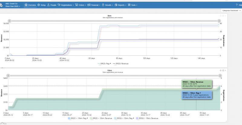 The default dashboard(s) apply to all events—past, present, and future. When customizing graphs on the default dashboard, it's recommended to use “event” level data instead of selecting specific categories. This ensures the data is relevant across all events.