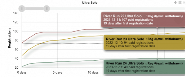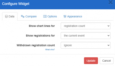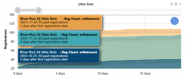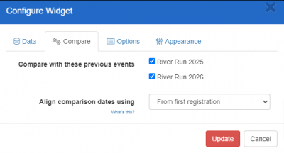 To provide these answers the registration graphs allow comparison of a single event section or category, which can then be compared against the same from previous versions of the event. You can add as many registration graphs to the dashboard as you like and each one can be configured separately. For example, it's easy to create a dashboard with a separate graph for each event category showing multi-year trends for that category.